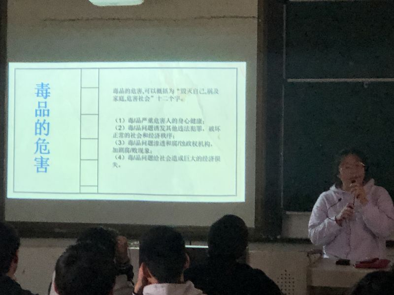 其次,於老师又向同学们讲解的毒品的危害性。毒品会严重危害到人的身心健康,在涉及犯罪的同时也会给社会造成巨大的经济损失,在此之后,於老师又描述了两个真实的例子来阐述毒品的危害性。同学们对此都踊跃发表了自己的观点。