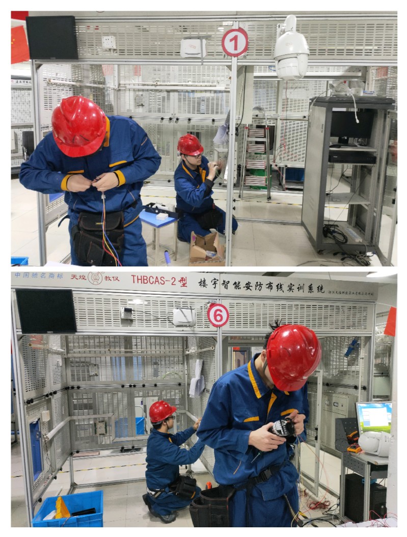 本次比赛分理论考核和技能实操两部分,其中技能实操内容分为两个阶段,其中,第一阶段1小时,每组选手需在规定时间内完成建筑智能化系统安装与调试的任务实施表格和BIM建模。第二个阶段4小时,选手需按照任务书的要求和规定,完成建筑智能化系统的硬件安装与调试,其中包括对讲门禁控制系统、安防报警系统、视频监控系统、巡更系统、DDC系统以及环境监测系统,任务量大,比赛时间长。因此,这场比赛不仅是对专业知识的考验,也是对选手团队合作以及体能和毅力的磨练。