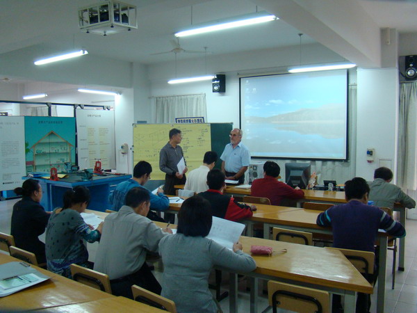 培训的主要内容有:德国给排水、暖通专业领域的学习目标与内容,技术类培训的考试标准,以工作过程为导向开发教学大纲的方法。培训是围绕一个职业学校二年级学习领域中的项目来进行的,汉克先生以卫浴管道安装的工作过程,建立工作情景与学习情景一体化的行动导向教学模式,展开学习领域课程方案的研讨及项目教学法的介绍,并指导教师每4人为一组共同完成项目任务。最后一天,汉克先生还面对全校年轻教师作了“德国职业教育的改革与发展趋势”的讲座。