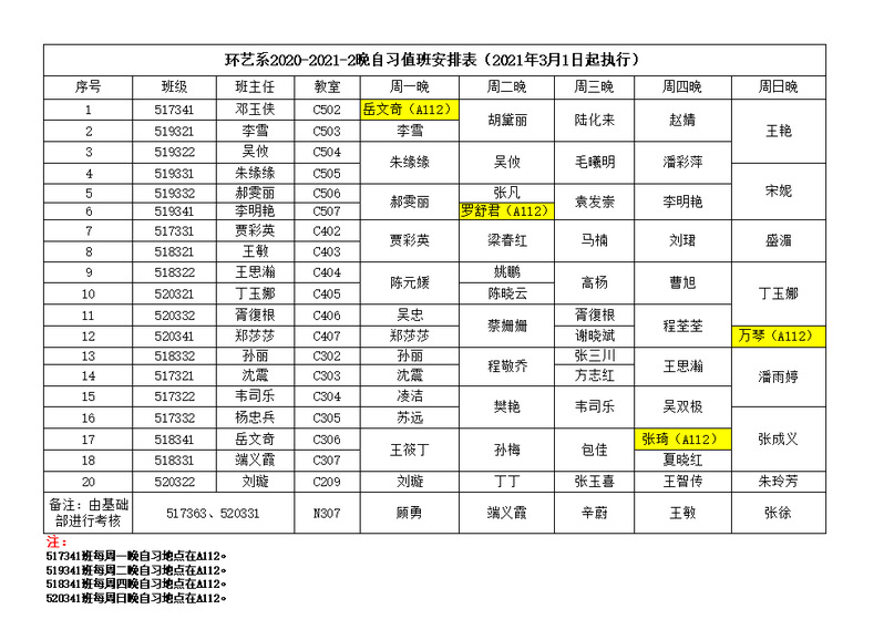 2020-2021-2环艺系全员育人值班表