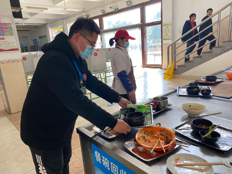 活动刚开始,负责收拾餐盘的同学们就立马进入食堂,发挥自己火眼睛睛的“技能”,准确寻找没有倒掉的餐盘,拍照的同学紧随其后,精准抓拍。