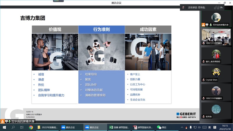 接着,来自上海吉博力房屋卫生设备工程技术有限公司的技术服务经理范华良先生,为同学们详细介绍了吉博力集团的价值观、行为准则、和成功因素,向大家展现了优质的企业文化;另外,他还对同学们关注的职业生涯发展,进行了说明。