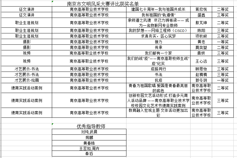 校网讯)在2019-2020学年南京市中等职业学校“文明风采”大赛评比活动中,我校荣获市级优秀组织奖,本次共上报19件作品,获市级奖励15件作品,刘纯等7位老师获市“文明风采大赛优秀指导老师”称号。