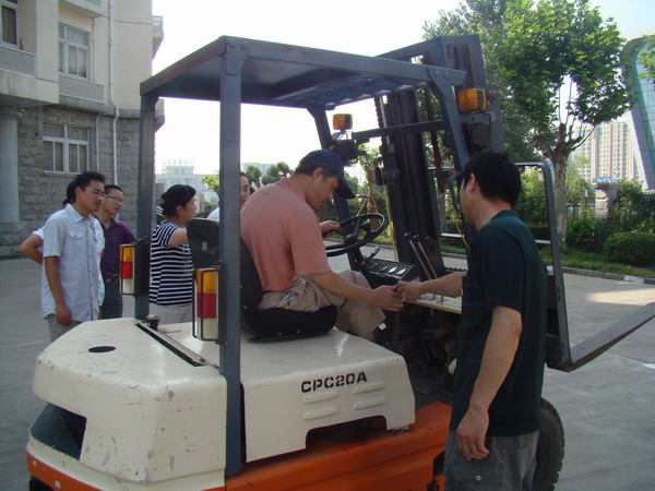第四天,施工机械实际操作--开叉车,今天的项目,老师们兴致很高,经常开车的老师开叉车时也丝毫不敢马虎,在陈主任的指导下,每位老师都个个试开成功!