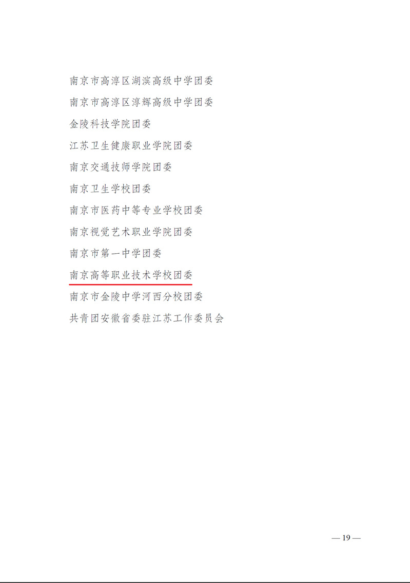 南京高职校校网讯)近日共青团南京市委公布表彰文件,全市行业范围表彰了70基层团委南京市五四红旗团委,我校团委经过自主申报、上级团组织推荐、团市委考察及现场答辩,脱颖而出被授予五四红旗团委称号。近年来,校团委在校党委、校长室及上级团组织的领导下,在组织建设、阵地建设和学生活动上开拓创新,做好团员青年思想引领工作,服务学生成效显著,先后团省委、团市委等上级团组织表彰(文:校团委秦滔;图:团市委表彰文件;审核:朱增力